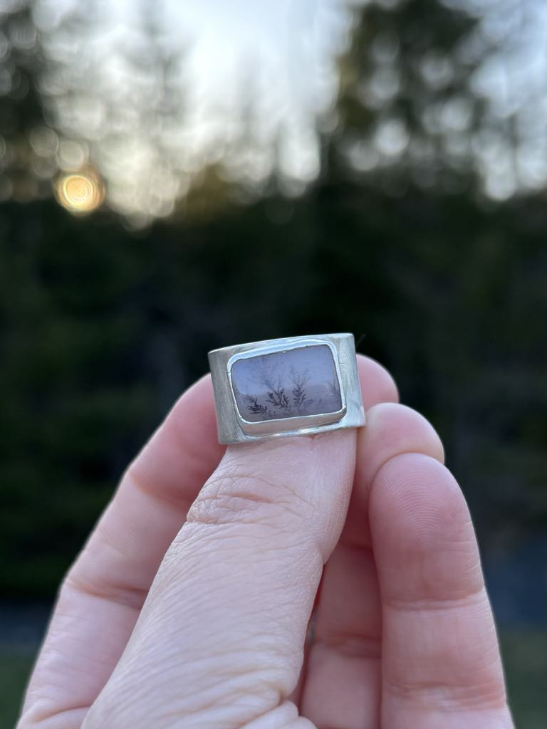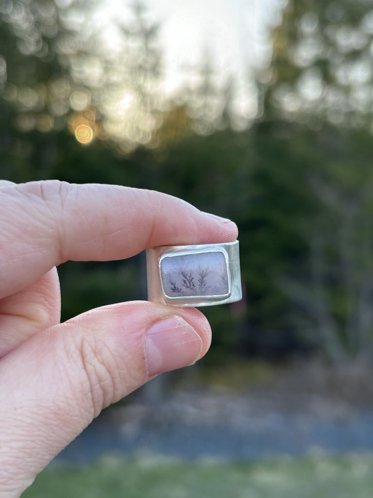 This stone reminded me of a pink/purple fine mist or fog rolling in off the water and/or into the woods and kissing all of the plants as it passes through! Making you pause and take a closer look!