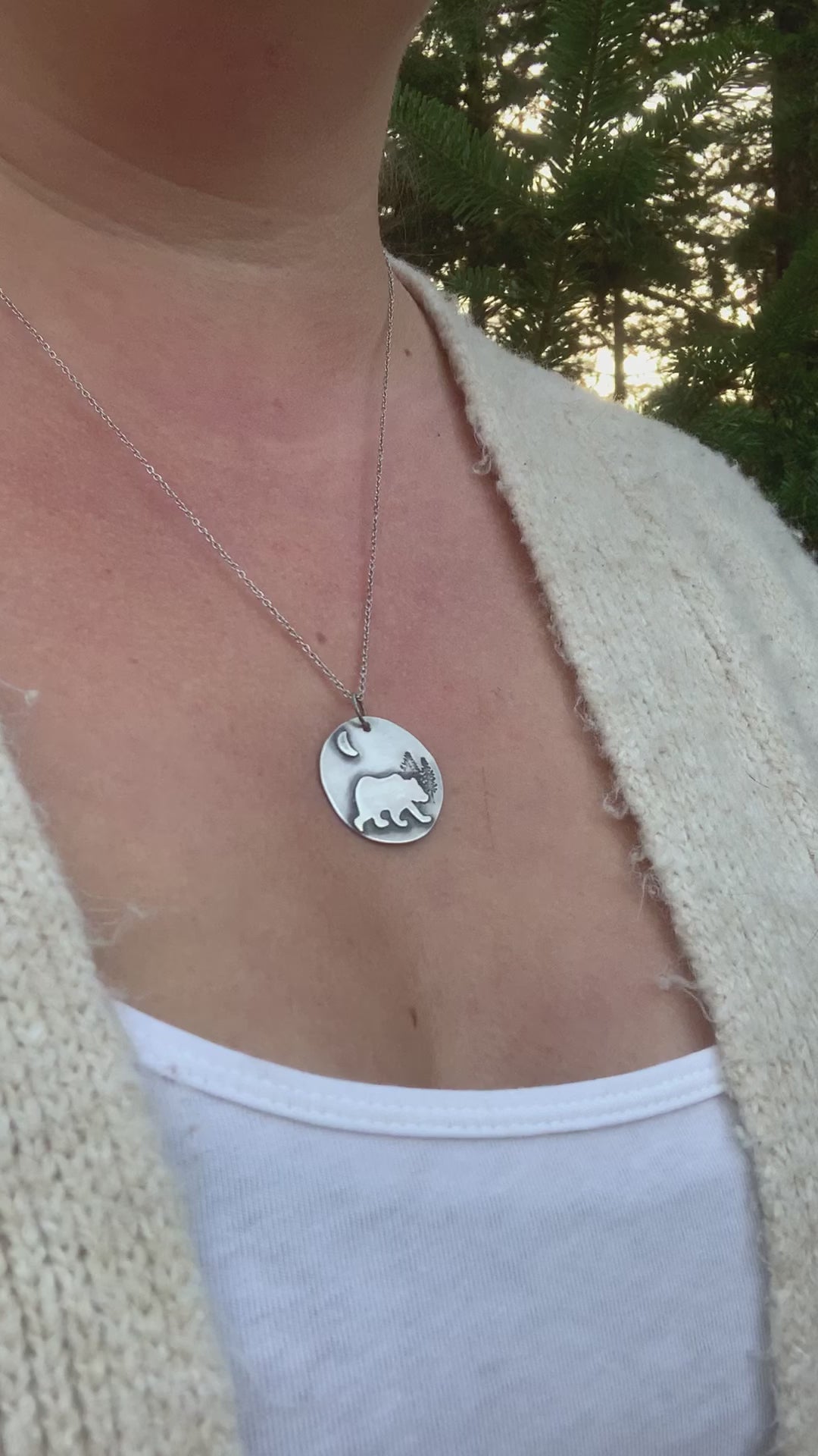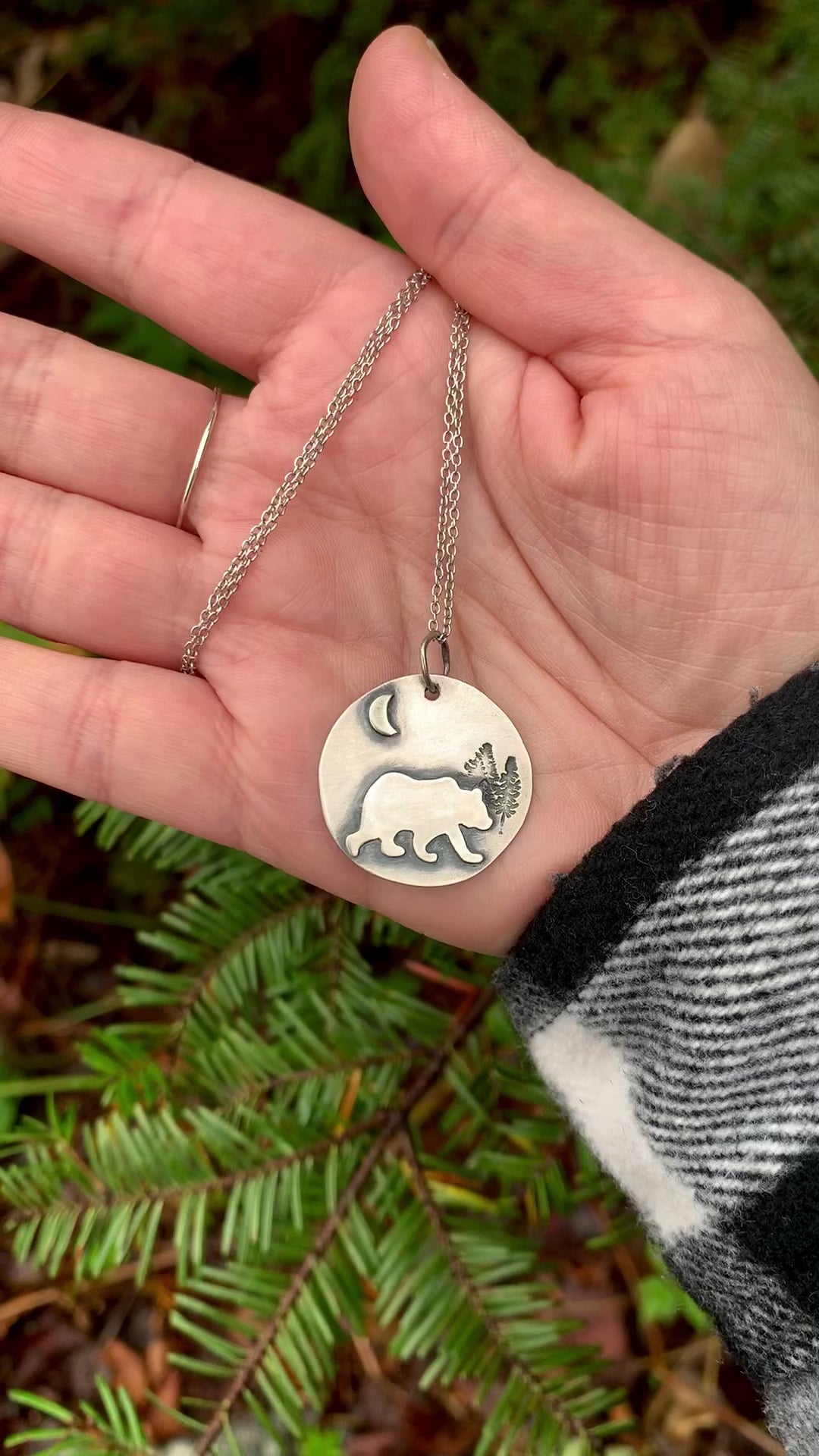 I combined this layered hand cut bear and moon pendant with a second side which has the bears paw! Allowing you to wear it both ways!